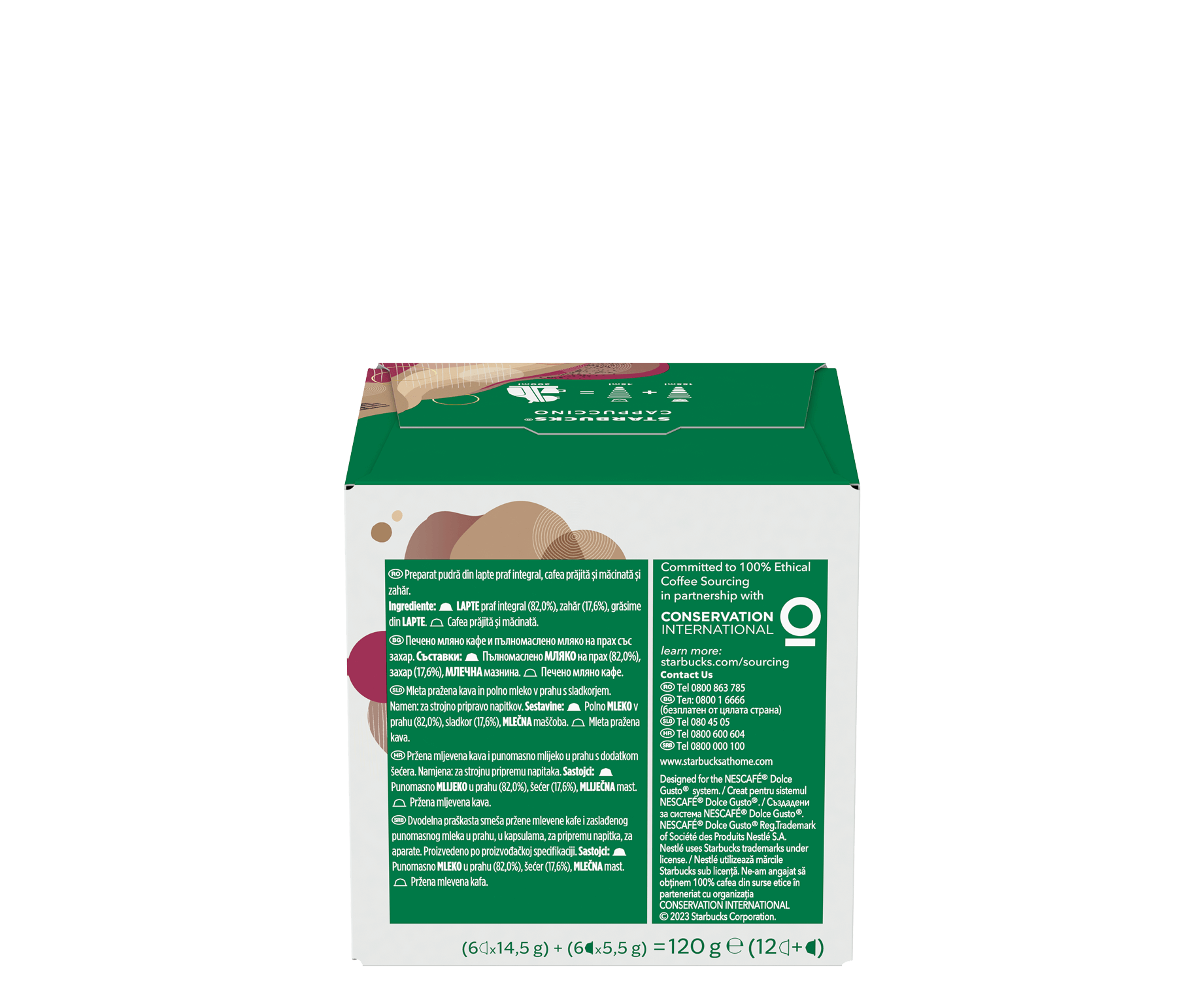 Вдъхновено от STARBUCKS Cappuccino, което обожавате ― балансирано, нежно и с любимия познат вкус, което може да приготвите у дома с Вашата кафемашинаNESCAFÉ® Dolce Gusto.