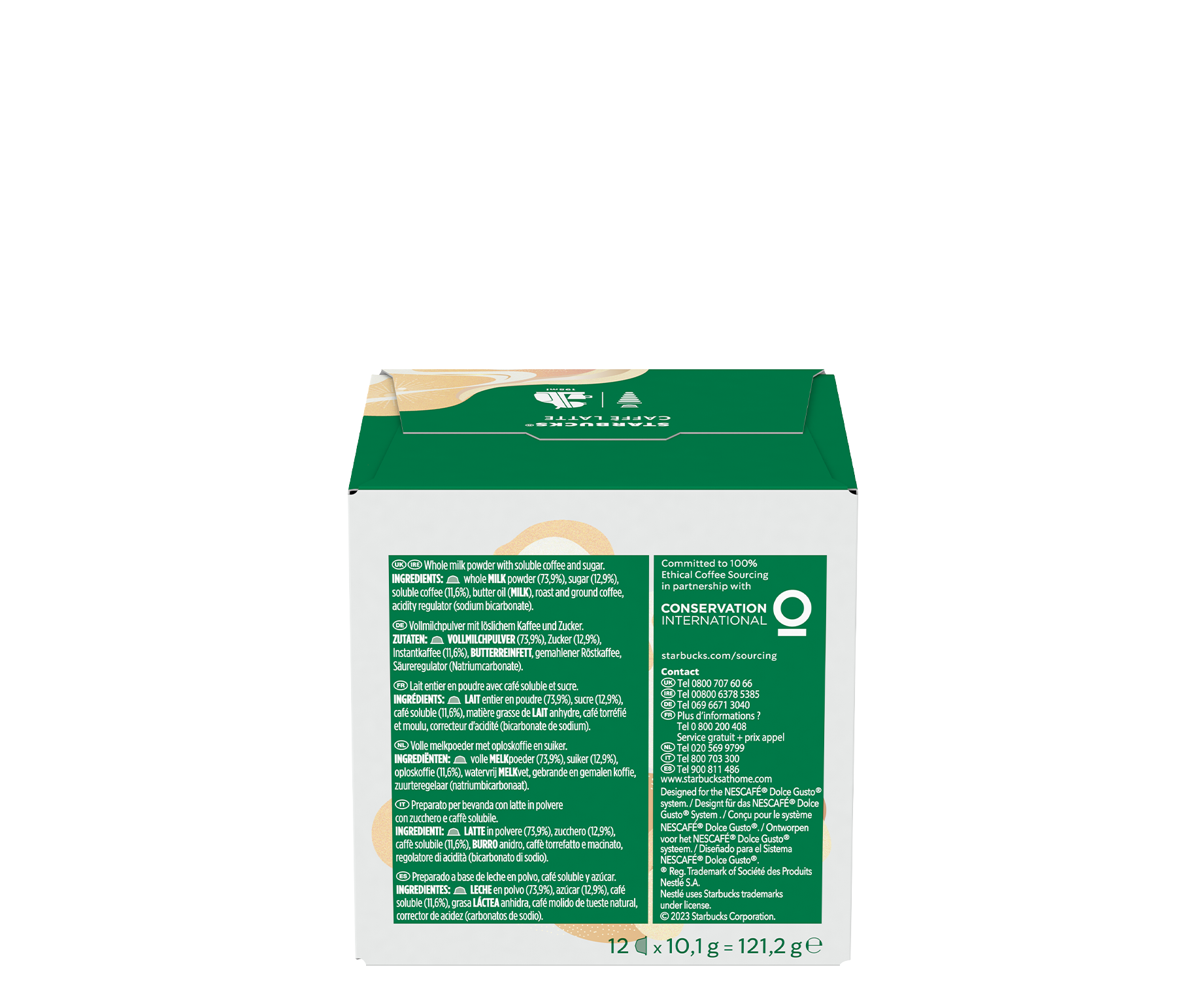 Disfruta de la suave y cremosa delicia del Starbucks® Caffè Latte de NESCAFÉ® Dolce Gusto®, un paquete de 12 cápsulas con espresso perfectamente equilibrado y leche espumosa para una experiencia de calidad de cafetería.