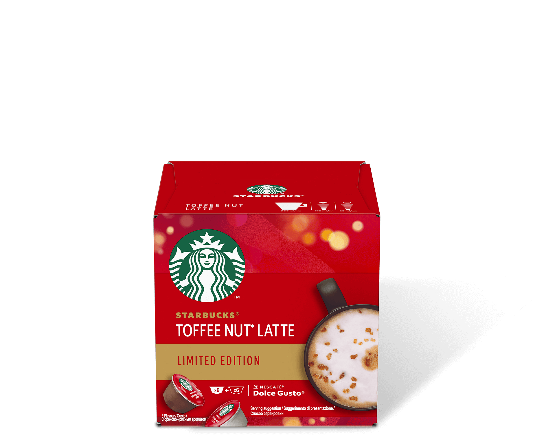 A karácsonyi időszakra megalkottuk a Starbucks® Toffee Nut Latte különleges, limitált kiadását NESCAFÉ® DOLCE GUSTO® kapszulákkal. A Starbucks® ikonikus karamellás-mogyorós ízű Toffee Nut kávéja által ihletett szezonális kedvenc a kiváló minőségű 100% Arabica kávét ötvözi tejjel, édes vajkaramella és pirított dió gazdag ízvilágával, a tetején lágy habréteggel koronázva.